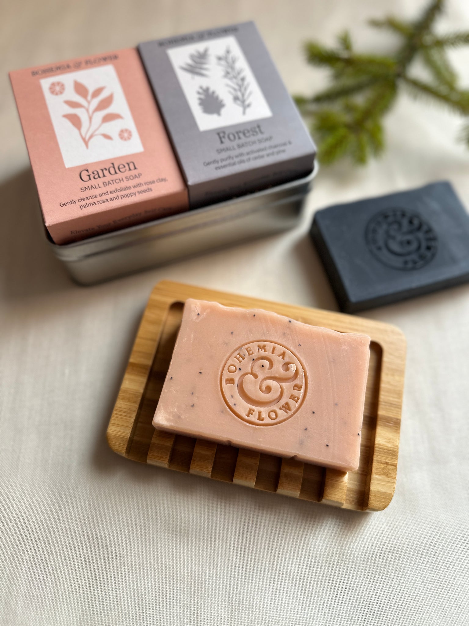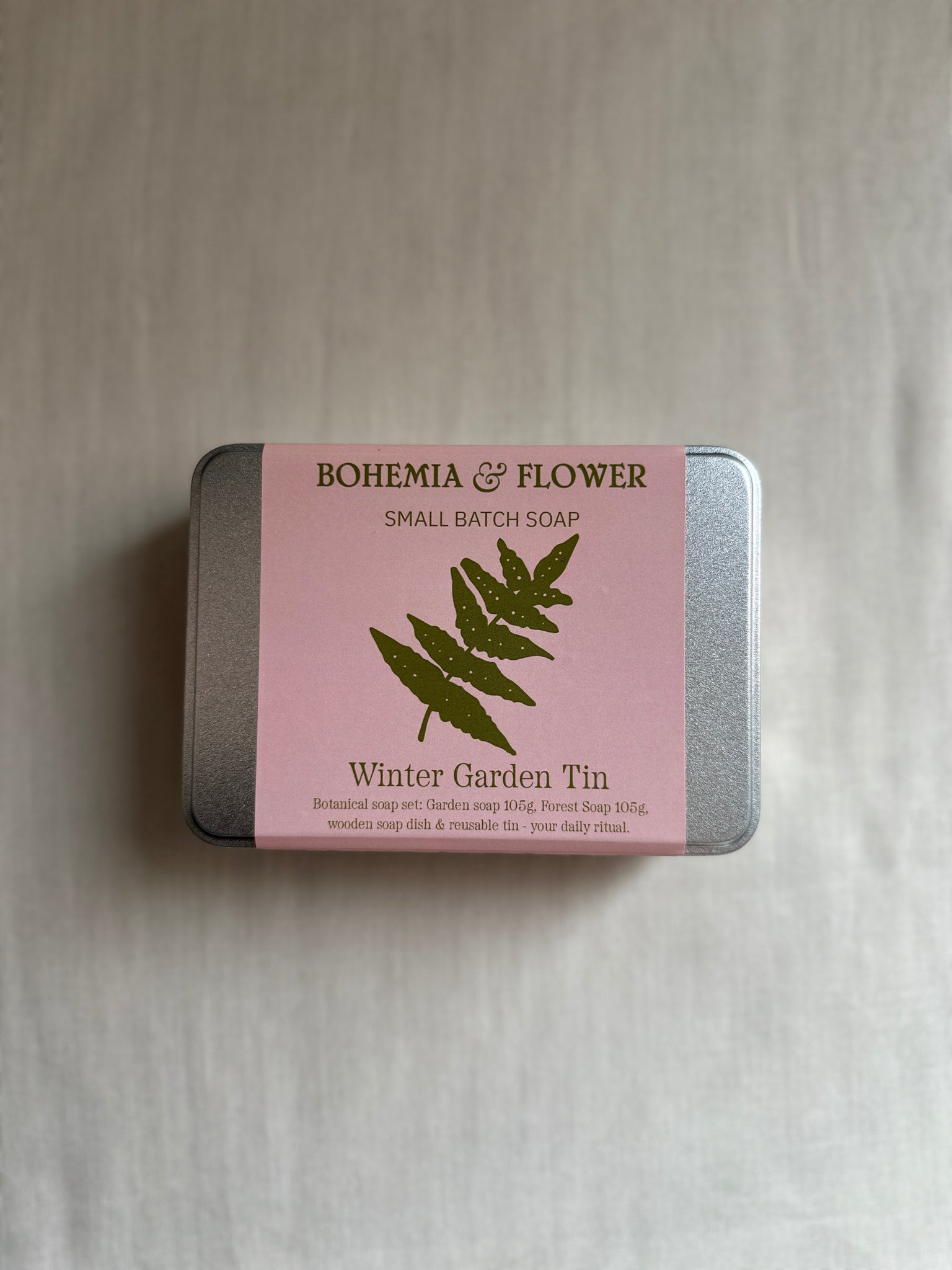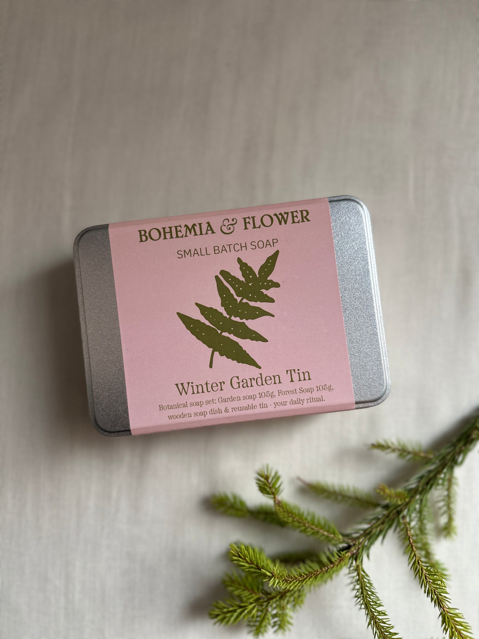 Celebrate winter self-care with our Winter Garden Soap Tin, a limited edition, zero-waste gift set crafted for botanical bathing rituals. Perfect for gardeners, plant lovers, and eco-conscious friends, this festive tin includes two botanical 105g soaps - Forest with herbal, resinous notes of cedarwood, juniper, rosemary and pine and Garden with gentle exfoliation from pink clay and poppy seeds, scented with lavender and Palmarosa - paired with a handcrafted wooden soap dish, all presented in a durable, reusable tin.